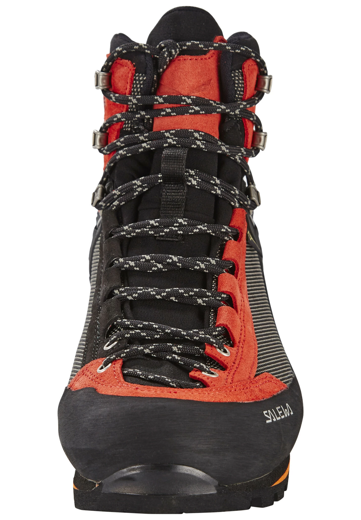 Chaussure alpine avec gaine en caoutchouc intégral à 360° et laçage spécial escalade.